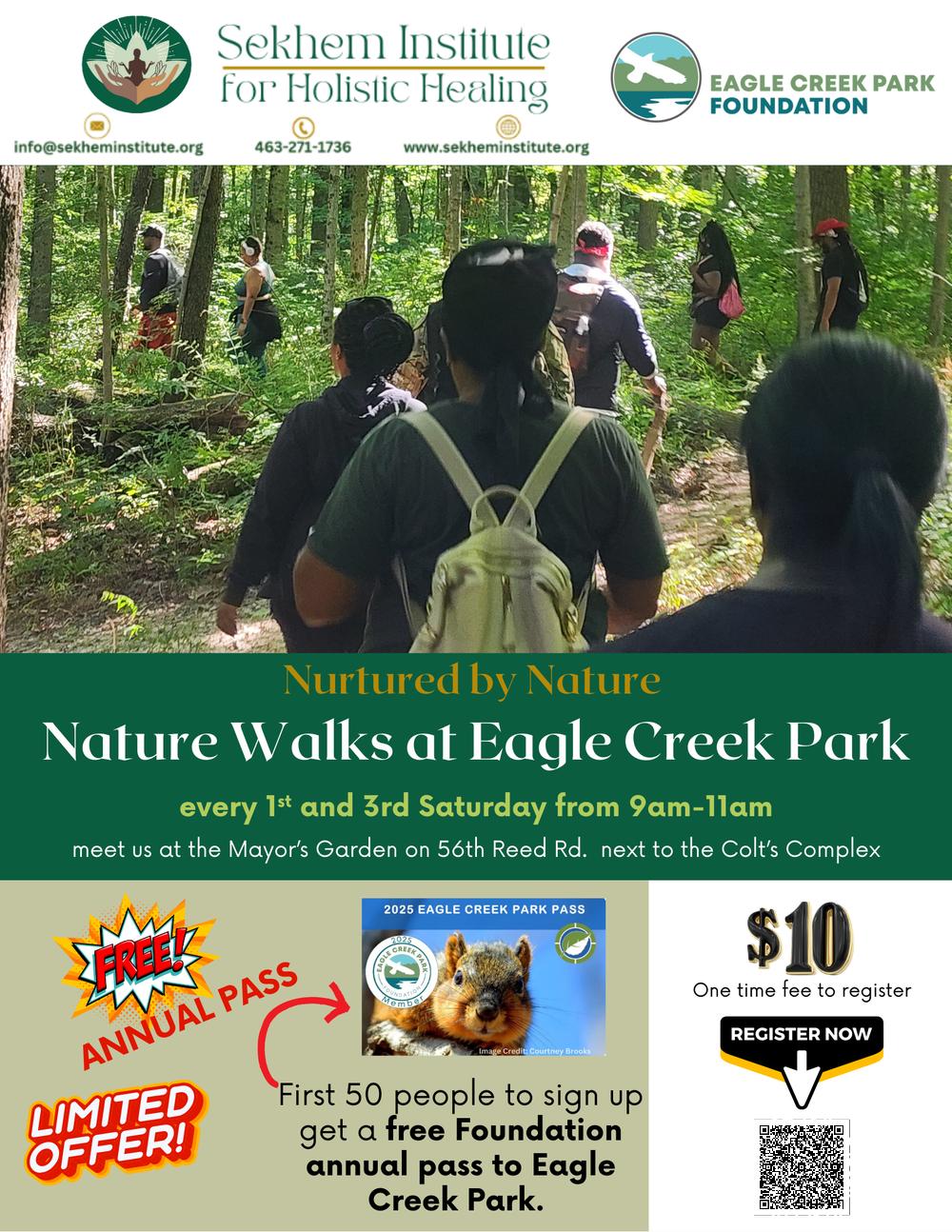 Sekhem Insitute is hosting nature walks at Eagle Creek Park in 2025 every 1st and 3rd Saturday from 9 am to 11 am starting in April. The first 50 people to sign up will receive free annual pass to Eagle Creek Park which gets you free entry to the park throughout the year and discounts on events and merchandise. Meeting details will be sent via email upon registering.